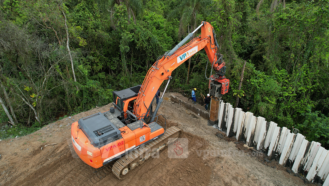 A VPA Infra atuou de forma integrada, sendo responsável, tanto pelo fornecimento das Estacas Prancha de PVC, quanto pela execução da cravação, utilizando equipamentos adequados ao método construtivo e equipe técnica especializada. Esse modelo de solução completa permitiu maior controle sobre a execução, alinhamento das estacas e qualidade final do sistema instalado.