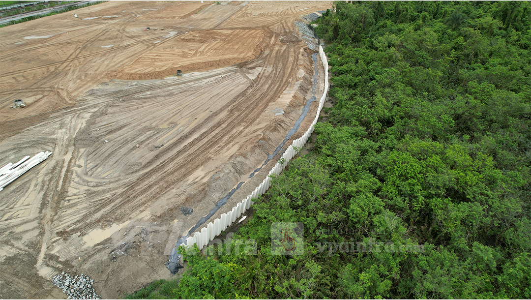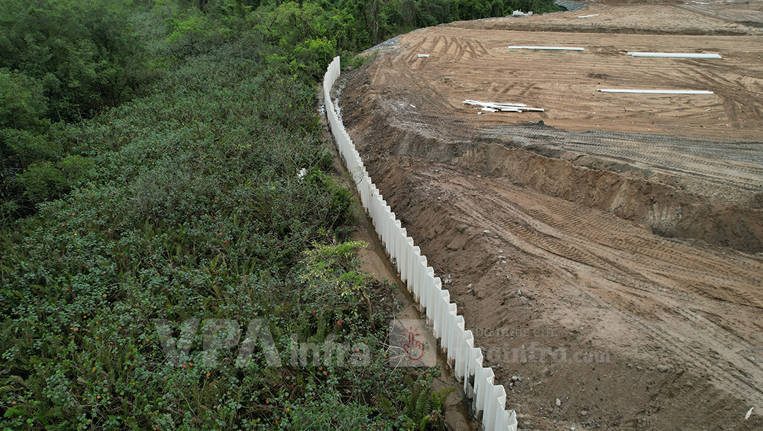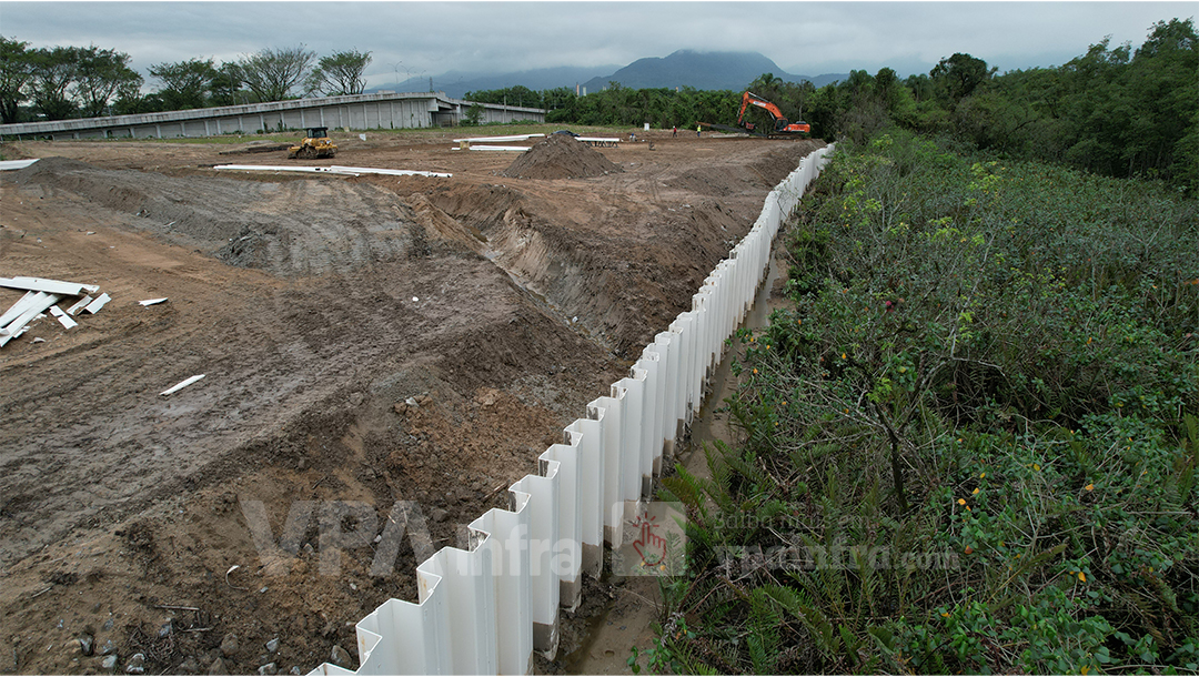 Após a análise técnica das condições do local e das exigências do projeto, optou-se pela adoção das Estacas Prancha de PVC (Vinílicas) da VPA Infra, formando uma linha contínua de contenção ao longo de todo o perímetro, com a função de separar fisicamente a área do aterro da área de preservação ambiental.