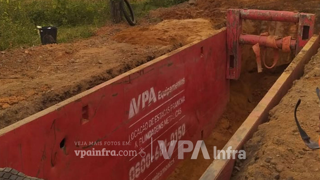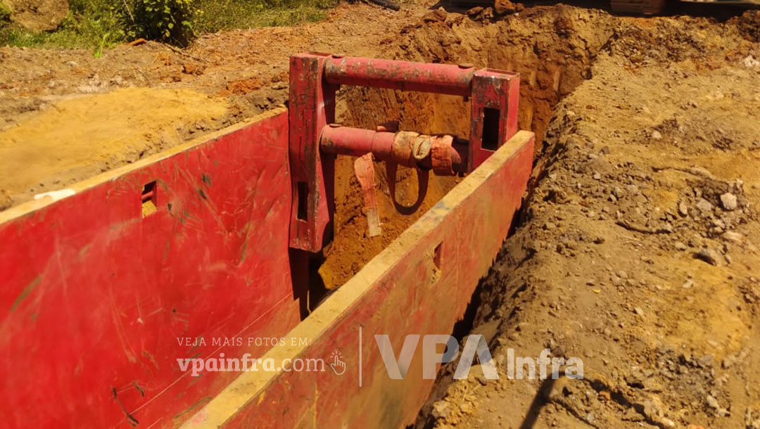 A VPA Equipamentos atendeu mais uma grande obra no estado de MG. A construção da adutora de Governador Valadares, fiscalizada pela Fundação Renova, possuía aproximadamente 92 km de extensão. A água foi captada através do rio Corrente Grande, que por meio de grandes tubulações de aço, foi transportada até as ETAs (Estação de Tratamento de Água) e assim abasteceu toda a cidade e vizinhança. Como o projeto contemplava diversas particularidades, tanto em aspectos técnicos como físicos, a VPA Equipamentos, através do seu corpo técnico de engenheiros e consultores contribuiu na elaboração e confecção de todos os projetos de escoramento. Vale ressaltar ainda que a obra atingia desde a zona rural até grandes centros urbanos, o que fez com que nossos especialistas dimensionassem a aplicação das blindagens metálicas de vala, para realizar o assentamento de todas as tubulações. É importante destacar que o uso das blindagens de vala deve ser feito por profissional qualificado ou pelo responsável técnico da obra. Fatores como: profundidade de escavação, presença de água, sobrecargas, tipo de solo, etc... devem ser avaliados criteriosamente em cada projeto. Por se tratar de uma obra muito extensa, a maioria da tubulação seria construída no subsolo, logo foi identificada uma grande variação na profundidade das escavações, sendo necessária uma customização de projeto e modelo de blindagem para cada frente de serviço.