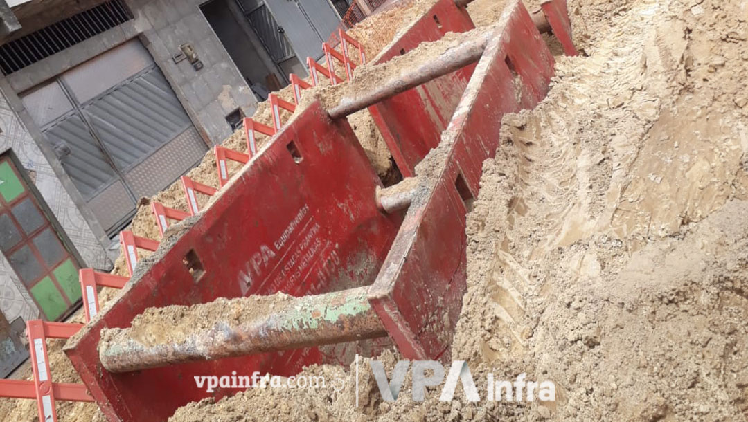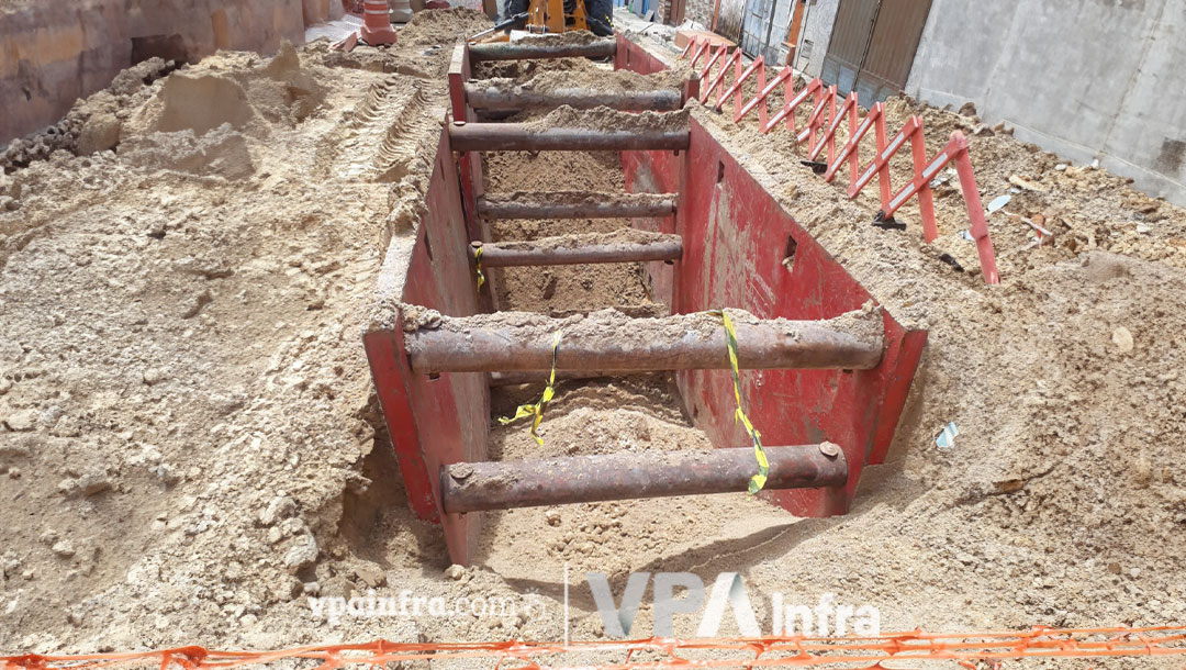 Essa obra refere-se a um serviço de extensão de rede de esgoto realizado em Camaçari/BA, entre residências em um bairro populoso. A solução oferecida pela VPA tinha como foco garantir a segurança dos operários, prevenir os possíveis efeitos de empuxo do solo que poderiam afetar a vizinhança e garantir a fluidez da execução, mesmo em uma rua estreita. Para enfrentar esse cenário desafiador, recomendamos a utilização de Blindagens Metálicas de Vala, assegurando um escoramento adequado para evitar colapsos e paralisações da obra.
