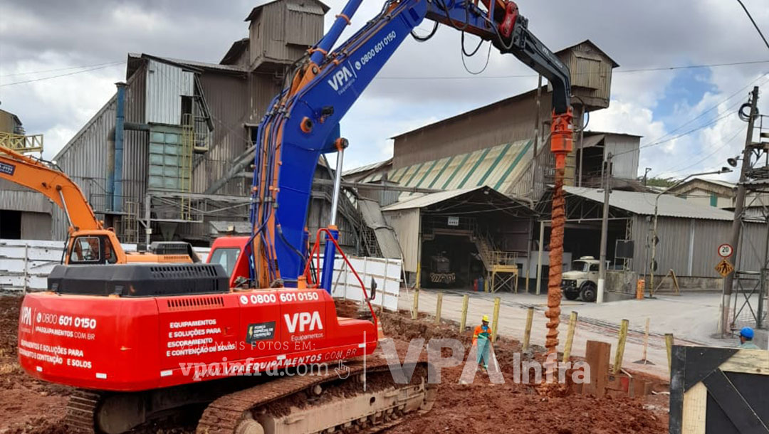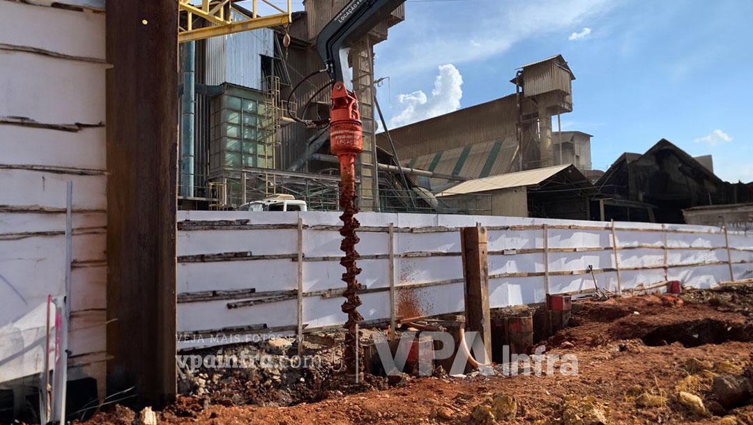 Com a expansão e reforma da fábrica da Magnesita, foi necessário a utilização das estacas prancha para escoramento dos blocos de fundação de diversas estruturas. O terreno onde as estacas foram cravadas caracterizava-se como material rijo a duro, possuindo um SPT médio de 25 golpes. Além disso, existia ainda uma camada rochosa há 5,0 metros de profundidade que precisava ser atravessada para atingir a cota de projeto estabelecida. Diante do cenário apresentado, a VPA com toda sua experiência e expertise, desenvolveu a solução de cravação através do martelo vibratório com o auxílio do drill perfuratriz. Vale ressaltar ainda, que a cravação das estacas prancha – em solos mais moles ou de baixa consistência, pode ser executada apenas com o martelo vibratório. Na obra em questão, por apresentar um terreno mais duro, foi indicado a utilização do drill perfuratriz para realizar um pré furo até atravessar a camada de solo rochoso. Logo em seguida, as estacas foram cravadas normalmente atingindo-se o nível esperado.