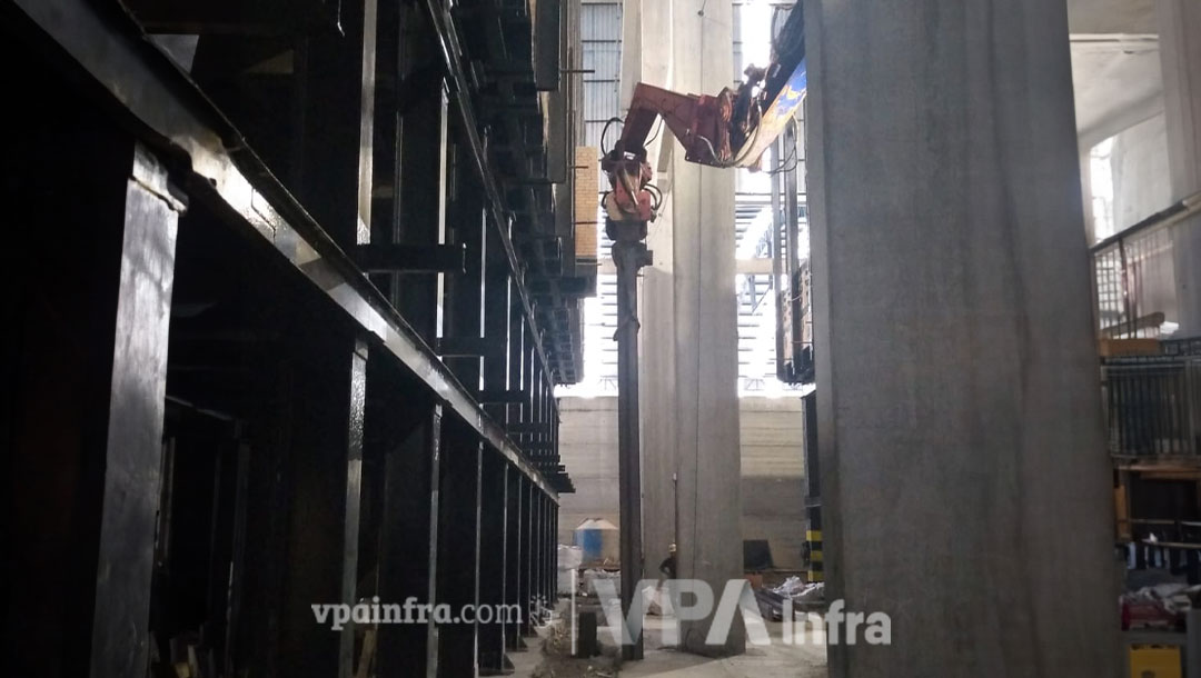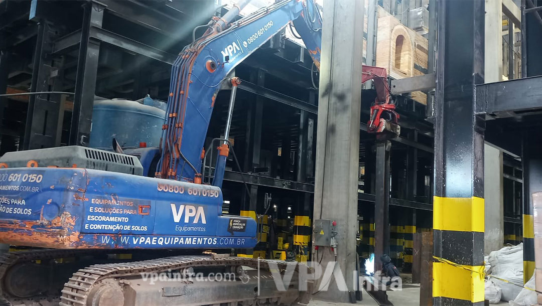 Desafio: Reforçar a fundação em solo instável, com nível elevado de água, em um espaço restrito. Solução: A VPA superou os desafios ao empregar a técnica de cravação de perfis HP310 x 110 até 20 metros de profundidade, utilizando um martelo vibratório acoplado a uma escavadeira hidráulica. Isso foi alcançado mesmo diante das limitações de espaço e da presença de obstáculos no local. Resultado: O objetivo foi plenamente atingido! A fundação foi reforçada de forma eficaz, demonstrando a competência de nossa equipe e a eficiência de nossa tecnologia mesmo em condições desafiadoras.
