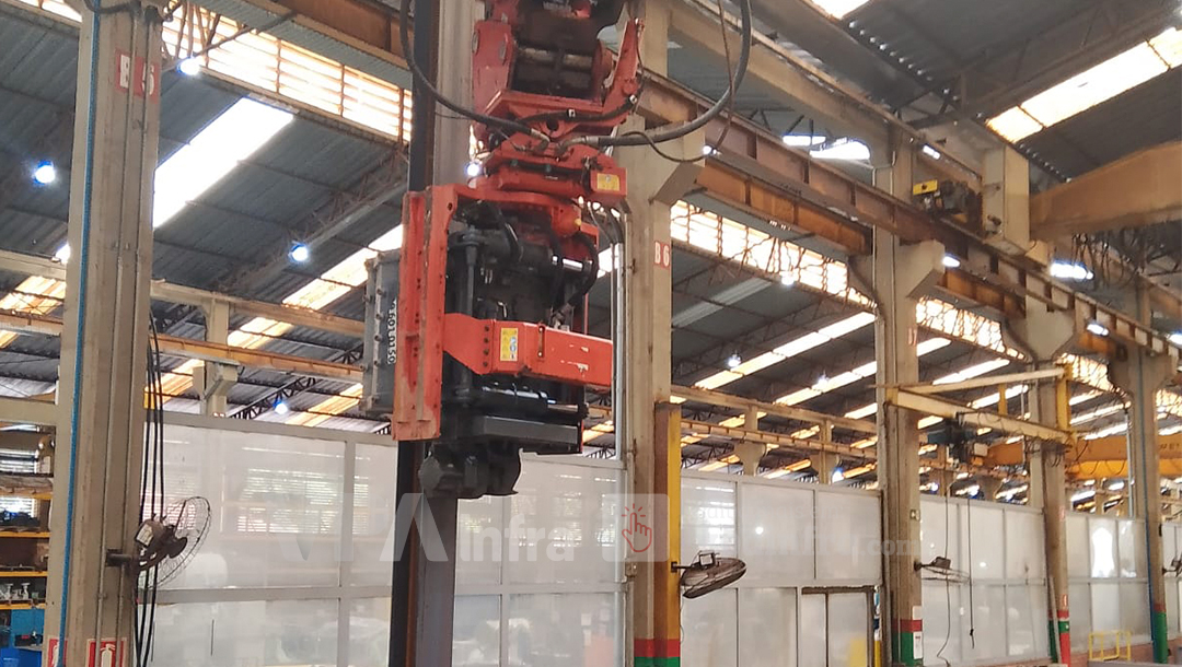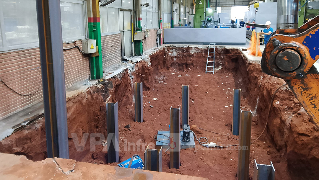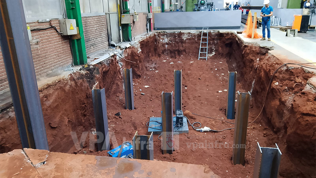 O ambiente industrial também exigia atenção especial ao controle de vibrações, à preservação do layout de máquinas de alta sensibilidade e à logística de entrada e saída da escavadeira. Era necessário garantir uma operação limpa, silenciosa, segura e sobretudo compatível com a rotina da fábrica, que não poderia ser interrompida. Esse conjunto de fatores evidenciou que a solução convencional não funcionaria. A escolha mais segura era o Martelo Vibratório de Garra Lateral da VPA Infra, capaz de operar em ambientes confinados e com baixa altura técnica, segurando o perfil pela lateral e permitindo uma cravação precisa sem a necessidade de grandes movimentos verticais.