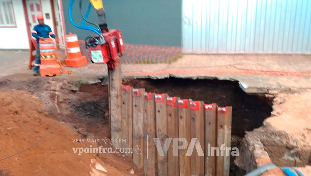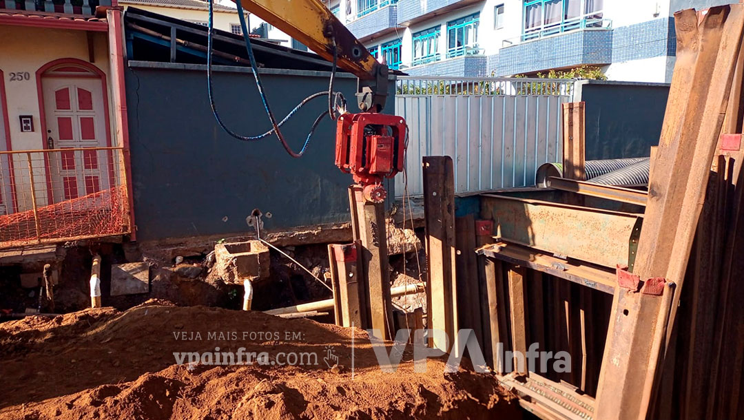 Devido a forte chuvas que atingiram a cidade de Mariana-MG no início de 2022, ocorreu uma grande erosão em uma das principais vias da cidade devido ao rompimento de uma tubulação de drenagem que se fez necessário a realização de uma obra emergencial. A empresa TC Obras, contratada pela prefeitura de Mariana-MG, realizou contato conosco da VPA Equipamentos afim de encontrar uma alternativa para realizarem a manutenção da rede danificada qual a melhor solução para conter o aumento de desmoronamento do solo, que acarretava risco para as casas próximas e interferências no trânsito local. A maneira encontrada para a realização do serviço foi através do escoramento com as estacas prancha metálicas, que dariam a segurança necessária para que não houvesse mais desmoronamentos naquele local e permitiria a realização das manutenções e trocas das tubulações comprometidas. As estacas pranchas foram cravadas com o Martelo Vibratório da VPA acoplada na máquina da própria TC Obras, que já possuía a escavadeira em obra, que além de proporcionar uma maior eficiência, minimizou os danos nas residências próximas devido a baixa incidência de ruídos e vibração, o que era uma preocupação do cliente.